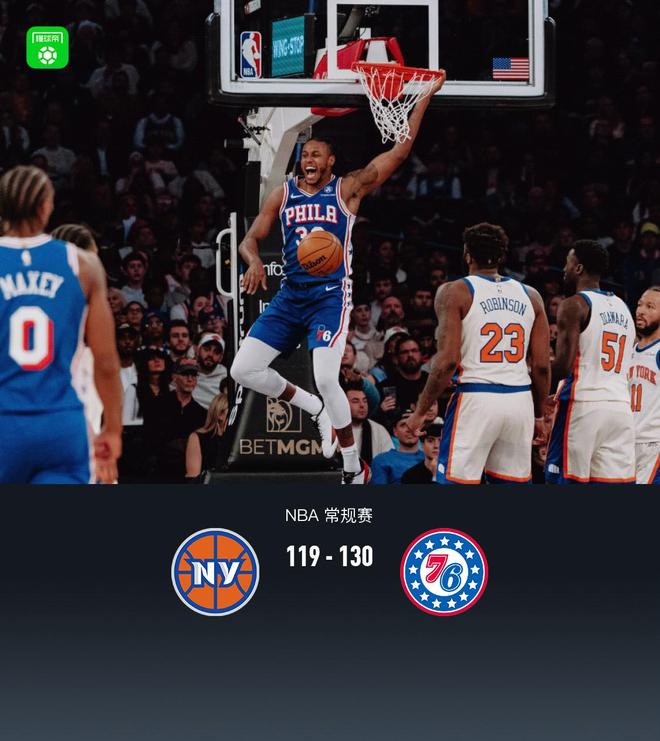 第四節(jié)尼克斯唐斯拿下12分,76人馬克西拿下9分,最終尼克斯119-130不敵76人