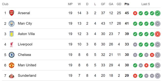 英超半程戰(zhàn)罷,積分榜前七名的格局可謂涇渭分明又充滿懸念。阿森納以45分強(qiáng)勢領(lǐng)跑,這個分?jǐn)?shù)已經(jīng)與阿森納2003-04賽季不敗奪冠時的半程積分相同,展現(xiàn)出了他們爭奪冠軍的穩(wěn)定性和決心。不過,2年前阿森納曾有過半程50分的壯舉,但仍在最后時刻被曼城反超。